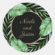Un joli autocollant tropical rond en noir et vert, ce design comporte un anneau de frondes de palmiers et de feuilles de banane entourant votre texte souhaité. L'exemple ci-dessous montre les noms d'une mariée et d'un marié. Personnalisez avec vos noms souhaités ou d'autres textes. Ces autocollants sont disponibles en deux tailles. La petite taille est un bon choix pour les scellés d'enveloppe ou à utiliser sur de petits faveurs et cadeaux. L'autocollant plus grand fait une belle partie favoriser étiquette, à utiliser sur des cadeaux plus grands, ou à utiliser sur d'autres articles.