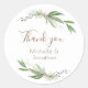 L'autocollant mariage personnalisé Merci dépeint d'élégantes verdure botanique d'aquarelle, y compris des arrangements simples de feuilles florales vertes et dorées. Customisez avec des noms.
