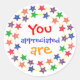 Deux cercles d'étoiles colorées entourent la déclaration, "Vous êtes appréciés", imprimée sur des autocollants. Une façon amusante et colorée de montrer votre appréciation.
