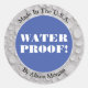 "Water Proof" Sticker in bold white caps in blue circle with water drops on white background. Comes with two extra text lines: Made In The U.S.A. and name. Or, personalize message and photo to your needs. Place on packages, etc.