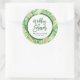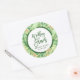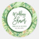 Autocollant rond wedding shower tropical avec feuilles d'aquarelle verte tropicale avec le mot "Wedding shower" en vert. Idéal pour une douche tropicale en couple. Consultez les éléments correspondants comme les invitations et les timbres ici https://www.zazzle.com/collections/green_watercolor_leaves_tropical_collection-119860212866787344?rf=238364477188679314 Personnalisez-le avec vos détails en remplaçant le texte de l'espace réservé. Pour plus d'options, cliquez sur le bouton "Customiser". *Veuillez noter que le filigrane Zazzle qui apparaît dans l'aperçu du zoom n'apparaîtra PAS sur le produit imprimé final. © Bois de rose et agrumes