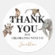 Beaux autocollants de remerciement sur le thème du zoo avec un simple arrière - plan blanc clair, d'élégants animaux de safari aquarelle (girafe, éléphant, singes), et un modèle de remerciement personnalisé moderne qui est facile à customiser.