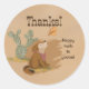 Le Sticker rond Wild West Rustic Happy Trails Cowboy Classic se distingue des autocollants anniversaires de enfants typiques par son flair vintage et ses tons terreux et muets. Doté d'un casquette cowboy, d'un coyote hurlant et de cactus du désert, il séduit par son charme occidental. Le design robuste de l'autocollant est parfait pour la fête occidentale d'un garçon. Cet autocollant de remerciement fantaisiste ajoute un adieu aventureux à chaque cadeau de remerciement ou sac de bonté.