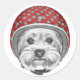 Ce dessin présente le portrait d'un Yorkshire Terrier portant un casque pointillé turquoise et rouge à pois.