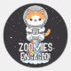 Cet autocollant présente un astronaute de chat de bande dessinée de style kawaii flottant dans l'espace avec une expression adorable. Le chat porte une combinaison blanche avec un casque rond, et il a une fourrure orange et blanche avec de jolies marques de rougeur rose sur ses joues. Au lieu de propulseurs traditionnels, le chat est propulsé par un panier de couleur arc-en-ciel, émergeant d'un nuage blanc et moelleux. L'arrière - plan est un espace extérieur sombre avec de petites étoiles blanches disséminées dans tout l'espace, ajoutant au thème cosmique. Au-dessus du chat flotte "Zoomies Engagé !" Ces mots peuvent être personnalisés. L'esthétique générale est ludique, colorée et fantaisiste, parfait pour les amoureux de les chats comme pour les amateurs d'espace !
