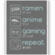Design cool avec les citations "Ramen, anime, jeu, répétition" avec ses traductions en japonais et un dessin pour représenter chaque mot". Disponible dans différents produits tels que chemises, tasses, tapisserie, masques et plus encore.