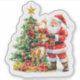 A cheerful Santa Claus stands beside a decorated Christmas tree, warmly interacting with a reindeer wearing a festive bow. Surrounded by colorful gifts and ornaments, the joyful scene captures the essence of holiday spirit and merriment.