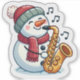 Un joyeux bonhomme de neige, portant un casquette et une écharpe douillets, joue joyeusement un saxophone entouré de notes musicales sous un ciel enneigé. Cette scène fantaisiste saisit l'esprit de la saison des Fêtes, remplissant l'air de joie festive et de mélodies délicieuses.