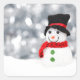 Joli petit bonhomme de neige qui brille au soleil. Écharpe rouge, chapeau noir et boutons verts.