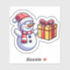 Un joyeux bonhomme de neige, orné d'une écharpe rayée rouge et blanche, et un casquette d'hiver douillet sourient avec brio tout en tenant un cadeau joliment emballé.