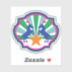 Un motif inspiré par des affiches de cirque vintage représentant une paire de poneys de spectacle bleus et en plumes dressés contre une starburst en turquoise et vert avec une étoile orange est présenté sur un sticker vinyle confectionné.