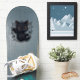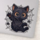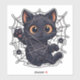 An adorable black kitten with large orange eyes caught in a silvery spiderweb, surrounded by small spiders. A charmingly spooky Halloween illustration. Great for cat lovers and Halloween enthusiasts.