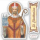 Saint Eleutherius était un prélat du sixième siècle, le premier évêque de Tournai. Il évangélisa les Franks païens de la région, puis la Gaule maintenant la Belgique. Il a vigoureusement plaidé contre l'Arianisme, une hérésie anti-trinitaire rampante de l'époque qui niait la divinité du Christ et affirmait que Jésus était créé par et non de la même substance que Dieu le Père. Selon la tradition, Saint Eleutherius était un martyr : il a été touché par un groupe d'Ariens alors qu'il quittait son église, battu et laissé pour mort ; il est mort quelques semaines plus tard des blessures qu'il a subies dans l'attaque c. 532. + Ici, saint Eleutherius, comme tout autre évêque, est habillé de robes épiscopales et tient un crosier, symbole de son autorité. Sa particularité est la cathédrale à cinq branches qu'il tient à sa droite. Le modèle de la cathédrale est facilement identifiable par ses flèches comme la cathédrale de Notre-Dame actuelle (en anglais, Notre-Dame de Tournai en français, et Onze-Lieve-Vrouw van Doornik en néerlandais). Commencé au XIIe siècle après la mort du Saint, le bâtiment repose sur des fondations beaucoup plus anciennes et combine trois styles et phases de construction distincts : le roman, le gothique et le baroque français. Aujourd'hui, la cathédrale abrite des vestiges de Saint-Eleutherius dans une poitrine à pignons argentée et dorée en cuivre ornée de sculptures en très haut relief. Le sanctuaire reliquaire est une commande de l’évêque Walter de Marvis de Tournai et s’achève en 1247, à l’occasion de la retraduction des reliques du Saint. C'est l'un des chefs-d'oeuvre de la métallurgie gothique. + Fête : 20 février + Crédit photo (DG 01) : Figure extraite d'une image antique de Saint-Eleutherius de Tournai d'un tirage dévotionnel allemand, publié à l'origine par la Deutsche Gesellschaft für christliche Kunst [Société allemande d'art chrétien], Munich, Allemagne, fin 19ème siècle, de la collection du designer de l'emera religieuse.