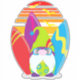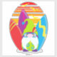 Adorable mignon autocollant gnome surfer. Un gnome alvéolé dans ses lunettes de soleil et ses shorts d'été, devant des planches de surf colorées, et le coucher du soleil.