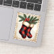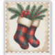 Un timbre-poste festif avec un bas de Noël à motif plaid rempli de baies sèches et d'aiguilles de pin, dressé contre un arrière - plan de style vintage.