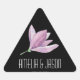 Autocollants triangulaires personnalisés avec une belle couleur de fleur de magnolia violet et votre texte en lettrage blanc chic sur un arrière - plan noir, parfait pour les faveurs de mariage, douche nuptiale, phoques faire-part de mariage et plus encore. Disponible sous différentes formes. OBJETS CORRESPONDANTS dans notre magasin.