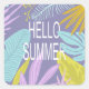 Lavender background with tropical foliage in pastel colors blue, pink and lime with custom script "hello summer"
