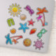 Les autocollants du scrapbook d'été. Chaque autocollant est en forme d’objet et comprend un soleil, des palmiers, des étoiles de mer/étoiles de mer, des coquillages, des tongs, une roue de navire et des lunettes de soleil. Des designs lumineux et colorés sont parfaits pour créer une page de scrapbook pour un anniversaire d'été ou une fête de piscine. Les autocollants en forme sont aussi amusants à donner aux fêtards comme faveurs, ou à utiliser pour décorer les enveloppes et l'emballage. Les tailles des autocollants seront corrélées à la taille de la feuille commandée.