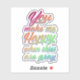 L'autocollant est doté d'un arrière - plan arc-en-ciel dynamique, qui sert de toile de fond colorée et relevante pour la citation, "vous me rendez heureux quand le ciel est gris." La citation exprime un sentiment de joie et de gratitude pour la présence d'une personne spéciale dans la vie de l'orateur. Il suggère que même lorsque le monde semble sombre et triste, la présence de cette personne apporte lumière et bonheur à leurs jours. L'arrière - plan arc-en-ciel renforce ce sentiment de joie et d'optimisme, car les arcs-en-ciel sont souvent associés à l'espoir et au renouveau. Les couleurs de l'arc-en-ciel se fondent harmonieusement, créant un sentiment d'harmonie et d'unité qui souligne davantage le message de la citation. Dans l'ensemble, cet autocollant sert de magnifique rappel du pouvoir de l'amour et de l'amitié pour égayer même les jours les plus sombres. Avez-vous des souhaits particuliers en matière de design personnel? N'hésitez pas à me contacter blackflyoleg@gmail.com
