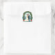 Comprend 20 petits autocollants sur une feuille. Illustration élégante d'une mariée et d'un marié sous une arche fleurie, avec en toile de fond une ville, parfaite pour les fêtes mariages.