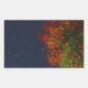 En levant les branches d'un arbre imposant en automne. Les feuilles en chute de bordeaux, de rouge, d'or, d'orange, de jaune et de bleu brillent contre le ciel bleu profond.