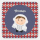 Un joli dessin animé pour le jeune garçon qui veut être astronaute, avec un spaceboy volant dans l'air avec des étoiles derrière lui. La bordure a un arrière - plan rouge avec des étoiles bleues et crème.