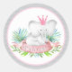Des autocollants de baby shower d'éléphant avec un adorable petit éléphant portant une couronne de princesse sur un arrière - plan en feuille de palme de jungle. Ces stickers doux pour bébés éléphants sont facilement customisés avec le texte de votre choix et vous pouvez également changer la couleur arrière - plan.