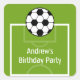 Des autocollants de fête d'anniversaire illustrant un ballon de football et un terrain de football. Personnalisez le texte. Recherchez les invitations d'anniversaire à Jill's Paperie.