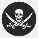 Autocollant rond montré avec un crâne de pirates mignon imprimé. Customisez cet objet ou achetez tel quel.