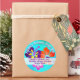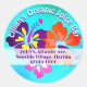 Des étiquettes d'adresse de retour d'affaires rondes et tropicales avec design de fleurs d'hibiscus audacieuses. Le nom de l'entreprise se courbe en haut et l'adresse est ajoutée sur une bande blanche. Les couleurs florales sont le violet et le jaune, l'orange vif et le rose chaud. Le texte d'ombre est utilisé pour le texte imprimé en haut et en violet pour l'adresse. L'arrière - plan est lumineux, bleu aqua. Choisissez les autocollants ronds ou carrés, et ces autocollants grands ou petits.