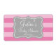 Bouteille d'eau de baby shower rose et gris étiquettes Personnalisé élégant do-it-yourself autocollant de bouteille d'eau modèle avec arrière - plan rayé et forme de support. Typographie stylisée pour le nom et la date de naissance du bébé garçon ou fille. Utilisez comme décor de table classe ou merci pour les invités à la fête. Design neutre avec couleur arrière - plan personnalisable.