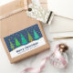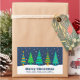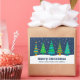 Un design géométrique moderne de cinq sapins en turquoise, turquoise et jaune doré. Le ciel est bleu marine avec de la neige blanche qui tombe. Le texte dit "Joyeux Noël" avec une section pour un nom personnalisé ou une famille.