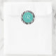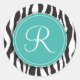 Cet adorable autocollant comporte un arrière - plan d'impression zèbre noir et blanc. Au-dessus se trouve un cercle turquoise avec une bordure blanche. Customisez la lettre à l'intérieur du cercle pour personnaliser le produit.