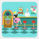 Servez quelque chose de spécial avec ces Stickers Fontaine Retro Soda. L'art minimaliste, dessin animé, présente l'intérieur du lieu le plus frais de la ville. C'est une fontaine de soda des années 50, dans toute sa gloire kitsch ! Sur fond de mur d'aqua, on peut voir des affiches annonçant les spécialités de la maison. Une affiche montre un hamburger et une bouteille de pop pour le prix d'affaire de 15 cents. L'autre affiche montre deux boules de crème glacée dans un cône de sucre pour seulement 5 centimes. Avec des prix comme ceux-ci, difficile de regarder sa taille ! Un réducteur de soda très compétent est d'habiller le comptoir turquoise avec des accents jaunes. Le jeune homme qui a une forte éthique du travail tient un cône de crème glacée avec une seule boule de crème glacée jaune citron—bien que, pour être honnête, il pourrait être de l'ananas ! L'homme nettoyé porte une chemise blanche immaculée avec une cravate noire et arc et un casquette blanc aux accents rouges. De l'autre côté du comptoir, on aperçoit trois tabourets de bar rouge et chrome. Perché sur l'un des tabourets est une adolescente blonde dont la bouche arrose sûrement. On ne sait pas si sa bouche arrose le cône glacé qui se dirige vers elle ou le jeune homme industrieux qui le sert. Elle porte une jupe de caniche rose et un toit noir ajusté à la forme. Ses serrures jaunes sont retirées dans une queue de cheval classique. A côté de cette jolie clientèle se trouve un juke-box coloré et classique, qui est composé de brun, de grains de bois, de boiseries et de néons colorés. Mieux encore, il est sûr de présenter tous les plus grands succès rock et roll de l'époque ! Le sol de ce glacier moderne du milieu du siècle est un aqua et turquoise motif en damier qui crie juste pour que quelqu'un puisse essayer toutes les dernières danses.