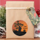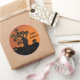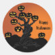 Autocollant de forme arrondie affiché dans une impression d'arbre citrouille hantée Halloween. Customisez cet objet ou achetez tel quel.