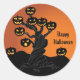 Autocollant de forme arrondie affiché dans une impression d'arbre citrouille hantée Halloween. Customisez cet objet ou achetez tel quel.
