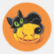 Autocollant de forme ronde en orange avec un mignon chat noir Halloween sur un citrouille. Customisez cet objet ou achetez tel quel.