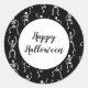 Un petit autocollant rond est affiché dans un squelette de danse d'Halloween. Customisez cet objet ou achetez tel quel.
