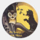 Carte postale vintage d'Halloween montrant un chat un peu tendu criant un avertissement au hibou aux yeux larges dans l'arbre. Réimprimé sur ces autocollants Halloween.