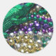Photographie de perles Mardi Gras avec une grande perle verte d'alligator. Les perles arborent les couleurs dorées, violettes et vertes de Mardi Gras. Personnalisez cette image avec votre propre texte et images en utilisant le bouton "Customiser".