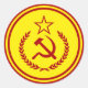 Un badge communiste avec le marteau et la faucille, une couronne de laurier et une étoile entourée d'un cercle jaune.