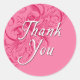 Beaux autocollants en rose rose avec un arrière - plan de défilement fantaisie. Texte : Merci. Ces autocollants sont de deux tailles et sont parfaits pour sceller les cartes de remerciement. Si vous envoyez des notes de remerciement pour des cadeaux de mariage, des cadeaux de baby shower ou toute autre raison, ces autocollants rendront vos enveloppes plus spéciales.
