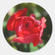 stickers Miniature Red Rose. Une jolie rosace rouge miniature sur le point de s'ouvrir recouverte de gouttes de pluie fraîches de printemps, dévale ses pétales mous. Un beau cadeau pour les amateurs de photographie rose, d'art floral et de design floral.