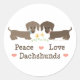 Montrez votre amour pour votre race préférée de chien avec ce design de Dachshunds Peace Love mignon sur t-shirts, tee - shirts, vêtements et plus de cadeaux d'amoureux doxie pour toute la famille. Deux adorables daches à poils courts et lisses se tiennent dans l'herbe et prennent le temps de sentir les fleurs. Cliquez ici pour voir toutes nos oeuvres d'art chic et originales © Chrissy H. Studios, LLC. Tous droits réservés.
