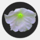 Cette feuille d'autocollants ronds présente une photographie d'une fleur de pétunia qui a été manipulée pour rendre le centre de la fleur vert brillant. Les pétales extérieurs sont blancs et les veines qui sortent du centre de la fleur brillent aussi de vert. La fleur est sur un arrière - plan noir pour la faire ressortir.
