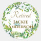 stickers RETRAITE élégant, étiquettes pour faveurs, enveloppes, sacs de bonne humeur et plus encore. Ce sticker à la retraite élégante avec des feuilles verts et du feuillage et blanc avec un soupçon de fleurs bleues est parfait pour une fête de retraite pour mari, femme, mère ou père, grands-parents, collègue, patron, enseignant ou autre. Modifiez simplement le texte pour répondre à vos besoins. Il a des polices modernes manuscrites et de style calligraphie en or et noir. Pour obtenir de l'aide ou faire correspondre les fournitures de la partie, contactez le concepteur ici.