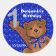 Un joli petit ours en peluche marron avec un arc bleu dansant dans les lumières bleues sont amusants autocollants ronds de 1er anniversaire qui peuvent être utilisés comme autocollants de livres à gratter avec des papiers scrapbook assortis disponibles dans mon magasin. Personnalisez le nom et la date à l'aide du modèle fourni.