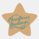 Salutations de Noël autocollants étoile de Noël avec un arrière - plan bronzé avec le texte bleu fantaisie qui lit les salutations de Noël. Cet autocollant classique et moderne en forme d'étoile est assorti à nos cartes photos de Noël Holly Jolly Joy, à nos cartes postales et à nos étiquettes de adresse.