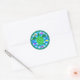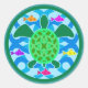 Une tortue de mer verte à la carapace à motifs, contre un motif d'eau/vague bleu, avec plusieurs poissons colorés. Conception circulaire avec bordure verte. L'art des tortues marines.
