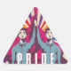 autocollants triangles de propagande de style vintage avec deux hommes en chemise bleue portant un drapeau rose. Derrière eux se trouve un écran de soleil arc-en-ciel. Le mot PRIDE se trouve au bas de l'autocollant en gras imprimé blanc.
